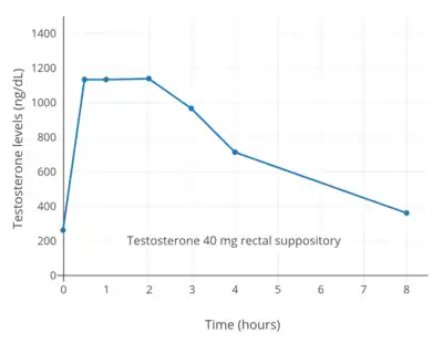 Testosterone can be taken by a variety of different routes of administration.[2][3] These include oral, buccal, sublingual, intranasal, transdermal (gels, creams, patches, solutions), vaginal (creams, gels, suppositories), rectal (suppositories), by intramuscular or subcutaneous injection (in oil solutions or aqueous suspensions), and as a subcutaneous implant.[2][3] The pharmacokinetics of testosterone, including its bioavailability, metabolism, biological half-life, and other parameters, differ by route of administration.[2] Likewise, the potency of testosterone, and its local effects in certain tissues, for instance the liver, differ by route of administration as well.[2] In particular, the oral route is subject to a high first-pass effect, which results in high levels of testosterone in the liver and consequent hepatic androgenic effects, as well as low potency due to first-pass metabolism in the intestines and liver into metabolites like dihydrotestosterone and androgen conjugates.[2] Conversely, this is not the case for non-oral routes, which bypass the first pass.[2]