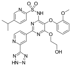 Tezosentan is a non-selective ETA and ETB receptor antagonist.[1] It acts as a vasodilator and was designed by Actelion as a therapy for patients with acute heart failure. However, studies showed that tezosentan did not improve dyspnea or reduce the risk of fatal or nonfatal cardiovascular events.[2]