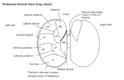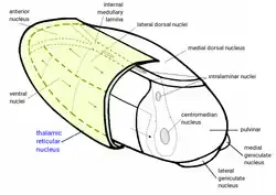 The thalamic reticular nucleus is part of the ventral thalamus that forms a capsule around the thalamus laterally. However, recent evidence from mice and fish question this statement and define it as a dorsal thalamic structure.[1][2] It is separated from the thalamus by the external medullary lamina. Reticular nucleus cells are all GABAergic,[3][4][5][6] and have discoid dendritic arbors in the plane of the nucleus.