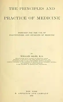 The Principles and Practice of Medicine: Designed for the Use of Practitioners and Students of Medicine is a medical textbook by Sir William Osler. It was first published in 1892 by D. Appleton & Company, while Osler was professor of Medicine at Johns Hopkins University. The book established Osler as the world's leading authority in the teaching of modern medicine.[1]
