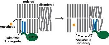The best characterized anesthetics site accounting for the Meyer-Overton correlation resides in ordered lipid domains. Anesthetics adhere non-specifically to the surface of a palmitate specific binding site within the lipid membrane, displacing the palmitate from ordered GM1 lipids. The process gives rise to a component of membrane-mediated anesthesia.[19] A similar mechanism was shown for luciferase.[20] The anesthetics bound non-specifically to a hydrophobic surface and out-competed the specific binding of luciferin. However luciferase is not physiologically relevant to vertebrates as it is not endogenously expressed in vertebrates.