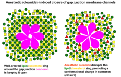 A slightly different detailed molecular mechanism of how bilayer perturbation can influence the ion channel was proposed in the same year. Oleamide (fatty acid amide of oleic acid) is an endogenous anaesthetic found in vivo (in the cat's brain) and it is known to potentiate sleep and lower the temperature of the body by closing the gap junction channel connexion.[33] The detailed mechanism is shown on the picture: the well-ordered lipid(green)/cholesterol(yellow) ring that exists around connexon (magenta) becomes disordered on treatment with anaesthetic (red triangles), promoting a closure of the connexon ion channel. This decreases brain activity and induces lethargy and anaesthetic effect.