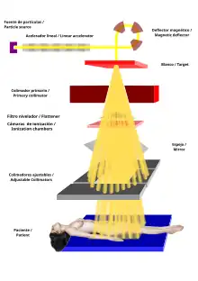 - Direct electron-beam therapy, in which a narrow, low-current beam of high-energy (5 to 25 MeV (0.80 to 4.01 pJ)) electrons was scanned over the treatment area by magnets;[6]