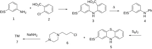 Goldberg reaction between 3-(ethylsulfanyl)aniline [1783-82-0] (1) and 2-chlorobenzoic acid [118-91-2] (2) to give the diarylamine, CID:82254530 (3). The carboxyl in the anthranilic acid residue, having performed its activating function, is then thermolytically removed to form [68083-49-8] (4). Upon treatment with sulfur and iodine, we get predominantly the phenothiazine [46815-10-5] (5); The rxn may well be aided by the presence of the electron donating thioether at the para-position. Alkylation with 1-(ɣ̞-chloropropyl)-4-methylpiperazine [104-16-5] (6) in the presence of sodamide affords Thiethylperazine (7).