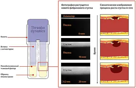 Thrombodynamics designed to investigate the in vitro spatial-temporal dynamics of blood coagulation initiated by localized coagulation activator under conditions similar to the conditions of the blood clotting in vivo. Thrombodynamics takes into account the spatial heterogeneity trombodinamiki processes in blood coagulation. The test is performed without mixing in a thin layer of plasma.