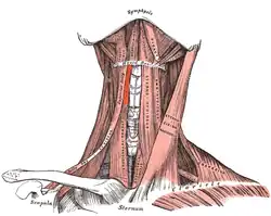 ![]() Muscles of the neck. Anterior view. (Thyrohyoideus visible center-left.) | |
