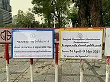 - ↑ ""นนทบุรี" ออกคำสั่ง ปิด 30 สถานที่ หนีไวรัสโควิด". Thansettakij (in Thai). 21 March 2020. Retrieved 29 March 2020.
