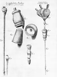 By 1805, the use of rectally applied tobacco smoke was so established as a way to treat obstinate constrictions of the alimentary canal that doctors began experimenting with other delivery mechanisms.[13] In one experiment, a decoction of half a drachm of tobacco in four ounces of water was used as an enema in a patient suffering from general convulsion where there was no expected recovery.[13] The decoction worked as a powerful agent to penetrate and "roused the sensibility" of the patient to end the convulsions, although the decoction resulted in excited sickness, vomiting, and profuse perspiration.[13] Such enemas were often used to treat hernias. A middle-aged man was reported in 1843 to have died following an application, performed to treat a strangulated hernia,[14] and in a similar case in 1847 a woman was given a liquid tobacco enema, supplemented with a chicken broth enema, and pills of opium and calomel (taken orally). The woman later recovered.[15]