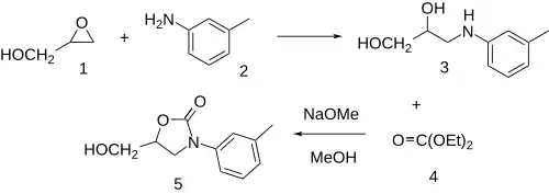 The reaction between glycidol (1) and m-toluidine (2) gives 3-m-toluidinopropane-1,2-diol (3). Treatment with diethyl carbonate (4) in the presence of sodium methoxide leads to an intermolecular cycloaddition to give tomoxatone.[3][4][5]