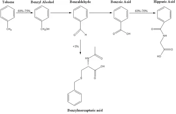 Benzylmercapturic acid, a minor metabolite of toluene, is produced from benzaldehyde.[19] In more recent years, studies have suggested the use of urinary benzylmercapturic acid as the best marker for toluene exposure, because: it is not detected in non-exposed subjects; it is more sensitive than hippuric acid at low concentrations; it is not affected by eating or drinking; it can detect toluene exposure down to approximately 15 ppm; and it shows a better quantitative relationship with toluene than hippuric acid or o-cresol.[20][21]