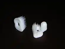 The small round brush head comprises seven tufts of tightly packed soft nylon bristles, trimmed so the bristles in the center can reach deeper into small spaces. The brush handle is ergonomically designed for a firm grip, giving the control and precision necessary to clean where most other cleaning aids cannot reach.[42] These areas include the posterior of the wisdom teeth (third molars), orthodontic structures (braces), crowded teeth, and tooth surfaces that are next to missing teeth. It can also be used to clean areas around implants, bridges, dentures and other appliances.[43]