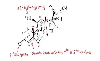 Hydrocortisone, or 17-hydroxycorticosterone, is under the class of glucocorticoids, which are steroids synthesized in the adrenal cortex of the kidneys.[30][31] In order to illustrate its glucocorticoid activity, the A ring of hydrocortisone has a keto group in the 3rd carbon and a double bond between the 4th and 5th carbon.[32] For the C ring of the compound, the 11th carbon has a beta hydroxyl substitution, which is also necessary for the drug to demonstrate glucocorticoid effects.[32]