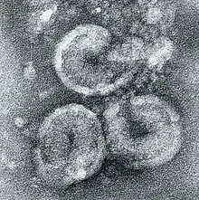 Toroviruses (ToV) are single-stranded RNA viruses that have a peplomer-bearing envelope that is often correlated with the enteric infections in cattle and possibly humans. These viruses appear to occur globally, occurrence of ToVs have been reported from countries in various continents like Europe, Americas, New Zealand and South Africa.[6] Torovirus particles typically possess a helical and symmetrical nucleocapsid that is coiled into a hollow cylindrical shape. The diameter is approximately 23 nm with an average length of 104 nm, where every turn cycle is at intervals of 4.5 nm.[5] ToVs are pleomorphic, with size ranging from 100 nm to 150 nm with club-like outgrowths extending from the capsid.[7][8] A nucleocapsid that is doughnut-shaped with helical symmetry is also discovered in Toroviruses.[2][9] Among various species of the Toroviruses, only equine torovirus (EToV) can be grown in the cell culture medium due to which EToVs have been most extensively studied. The information from immunofluorescence studies and morphology of the bovine Toroviruses (BToV) intestinal cells has shown similarities among the EToVs and BToVs.[6] Torovirus share some common characteristics with members of the related family Coronaviridae as they are round, pleomorphic, enveloped viruses about 120 to 140 nm in diameter.[9][10]
