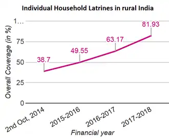 The rural household toilet coverage in India increased from 1% in 1981 to 11% in 1991, to 22% in 2001, to 32.7% in 2011.[43] On 15 August 2014, Prime Minister Narendra Modi from the Red Fort in Delhi called on the public to pay tribute to Mahatma Gandhi on his 150th birth anniversary by devoting a clean India. Narendra Modi was the first Prime Minister to take up the Clean India Movement on a massive scale.[44][45] Before the launch of Swachh India, 38.4% of rural households had toilets in 2013–14, 43.8% in 2014–15, 51.6% in 2015–16, 65.4% in 2016–17, 84.3% in 2017–18, 98.5% in 2018–19, and 98.5% in 2019–20. 100% toilet facility constructed.[46]