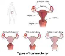 Hysterectomy, in the literal sense of the word, means merely removal of the uterus. However other organs such as ovaries, fallopian tubes, and the cervix are very frequently removed as part of the surgery.[60]