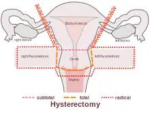 • Radical hysterectomy: complete removal of the uterus, cervix, upper vagina, and parametrium. Indicated for cancer. Lymph nodes, ovaries, and fallopian tubes are also usually removed in this situation, such as in Wertheim's hysterectomy.[61]