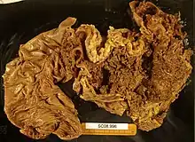 | Micrograph of pseudomembranous colitis, a cause of toxic megacolon. H&E stain. | |