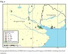 The exposure data were collected from a total of 129 hazardous waste sites distributed across Argentina (n = 23), Mexico (n = 62), and Uruguay (n = 44). In Figs. 1 and 2 the sites of geographical distributions are shown. An estimated population of 316,703 individuals were at risk of exposure (mean = 2455; median = 250 per site), which is approximately 0.19% of the total population of all three countries. There was an estimation of 80,021 individuals who were women of childbearing age (15–49 years of age), and 122,084 individuals who were younger than 18 years of age.