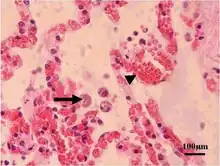 Acute toxoplasmosis is often asymptomatic in healthy adults.[13][14] However, symptoms may manifest and are often influenza-like: swollen lymph nodes, headaches, fever, and fatigue,[15] or muscle aches and pains that last for a month or more. It is rare for a human with a fully functioning immune system to develop severe symptoms following infection. People with weakened immune systems are likely to experience headache, confusion, poor coordination, seizures, lung problems that may resemble tuberculosis or Pneumocystis jirovecii pneumonia (a common opportunistic infection that occurs in people with AIDS), or chorioretinitis caused by severe inflammation of the retina (ocular toxoplasmosis).[15] Young children and immunocompromised people, such as those with HIV/AIDS, those taking certain types of chemotherapy, or those who have recently received an organ transplant, may develop severe toxoplasmosis. This can cause damage to the brain (encephalitis) or the eyes (necrotizing retinochoroiditis).[16] Infants infected via placental transmission may be born with either of these problems, or with nasal malformations, although these complications are rare in newborns. The toxoplasmic trophozoites causing acute toxoplasmosis are referred to as tachyzoites, and are typically found in various tissues and body fluids, but rarely in blood or cerebrospinal fluid.[17]