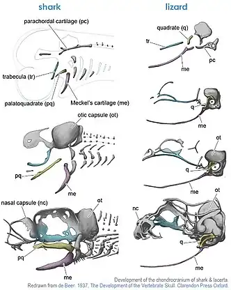 Most skeletons are of mesodermal origin in vertebrates. Especially axial skeletal elements, such as the vertebrae, are derived from the paraxial mesoderm (e.g., somites), which is regulated by molecular signals from the notochord. Trabecular cartilages, however, originate from the neural crest, and since they are located anterior to the rostral tip of the notochord,[1] they cannot receive signals from the notochord. Due to these specializations, and their essential role in cranial development, many comparative morphologists and embryologists have argued their developmental or evolutionary origins. The general theory is that the trabecular cartilage is derived from the neural crest mesenchyme which fills anterior to the mandibular arch (premandibular domain).
