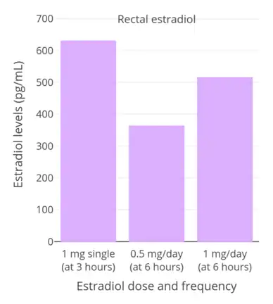 In postmenopausal women, a dosage of 1 mg/day oral micronized estradiol has been found to produce circulating concentrations of 30 to 50 pg/mL estradiol and 150 to 300 pg/mL estrone, while a dosage of 2 mg/day has been found to result in circulating levels of 50 to 180 pg/mL estradiol and 300 to 850 pg/mL estrone.[15] A study of oral micronized estradiol in transgender women found that mean estradiol levels across a dosage range of 1 to 8 mg/day were about 50 pg/mL at 1 mg/day, 100 pg/mL at 4 mg/day, and 150 pg/mL at 8 mg/day, with a wide degree of variation.[61] In another study, mean estradiol levels at steady state with 4 mg/day and 6 mg/day oral micronized estradiol were approximately 180 pg/mL and 265 pg/mL, respectively.[62] A study that used high to very high-dose oral micronized estradiol in postmenopausal women found that steady-state estradiol levels with 6 mg/day were about 300 pg/mL and with 30 mg/day were about 2,400 pg/mL.[63]