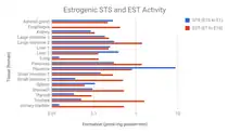 On the other hand, it has been suggested by some authors that the high levels of estrone and/or estrone conjugates with oral estradiol may result in excessive estradiol levels in certain tissues such as the breasts and endometrium, due to high expression in these tissues of the requisite enzymes (17β-HSDs and STS) necessary to transform these metabolites back into estradiol.[94][91][111][112] In accordance, circulating levels of estrone sulfate have been found to be positively associated with breast density in postmenopausal women treated with oral estradiol, with 1.3% higher breast density observed for every 1 ng/mL greater level of estrone sulfate.[113][114] Similarly, levels of estradiol, estrone, and estrone sulfate are all strongly associated with the risk of breast cancer in women.[113] Preclinical studies have shown that estrone sulfate, via local transformation into estradiol, stimulates the growth of mammary cancer cells.[115][116]