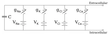 - ↑ The signs of ENa and EK are opposite. This is because the concentration gradient for potassium is directed out of the cell, while the concentration gradient for sodium is directed into the cell. Membrane potentials are defined relative to the exterior of the cell; thus, a potential of −70 mV implies that the interior of the cell is negative relative to the exterior.