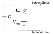 For fixed ion concentrations and fixed values of ion channel conductance, the equivalent circuit can be further reduced, using the Goldman equation as described below, to a circuit containing a capacitance in parallel with a battery and conductance. In electrical terms, this is a type of RC circuit (resistance-capacitance circuit), and its electrical properties are very simple. Starting from any initial state, the current flowing across either the conductance or the capacitance decays with an exponential time course, with a time constant of τ = RC, where C is the capacitance of the membrane patch, and R = 1/gnet is the net resistance. For realistic situations, the time constant usually lies in the 1—100 millisecond range. In most cases, changes in the conductance of ion channels occur on a faster time scale, so an RC circuit is not a good approximation; however, the differential equation used to model a membrane patch is commonly a modified version of the RC circuit equation.
