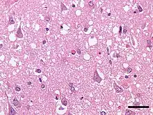 Micrograph showing spongiform degeneration (vacuoles that appear as holes in tissue sections) in the cerebral cortex of a patient who had died of Creutzfeldt–Jakob disease. H&E stain, scale bar = 30 microns (0.03 mm).