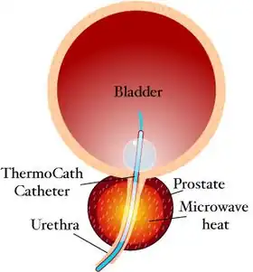 Transurethral microwave thermotherapy (TUMT) is one of a number of effective and safe[1] procedures used in the treatment of lower urinary tract symptoms caused by benign prostatic hyperplasia. It is an alternative treatment to pharmacotherapy such as alpha blockers, transurethral resection of the prostate (TURP), transurethral needle ablation of the prostate, photoselective vaporization of the prostate and prostatic removal or prostatectomy.[2]