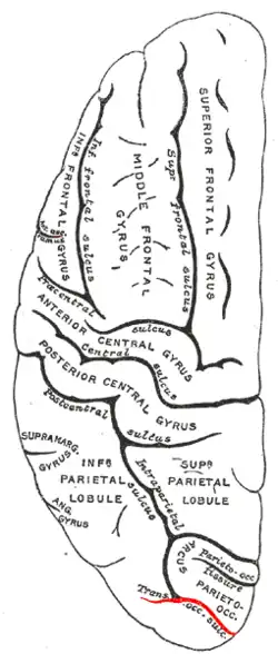 ![]() Lateral surface of left cerebral hemisphere, viewed from above. (Trans. occ. sulc. shown in orange.) | |
