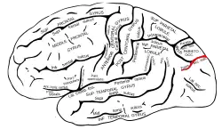 ![]() Lateral surface of left cerebral hemisphere, viewed from the side. (Trans. occ. sulc. shown in orange.) | |