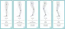 Classification of the gait pattern according to the Amsterdam Gait Classification: In gait type 1, the knee angle is normal and the foot contact is complete. In gait type 2, the knee angle is hyperextended and the foot contact is complete. In gait type 3, the knee angle is hyperextended and foot contact is incomplete (only on the forefoot). In gait type 4, the knee angle is bent and foot contact is incomplete (only on the forefoot). With gait type 5, which is also known as crouch gait, the knee angle is bent and the foot contact is complete.[130]