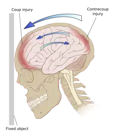 Damage may occur directly under the site of impact, or it may occur on the side opposite the impact (coup and contrecoup injury, respectively).[65] When a moving object impacts the stationary head, coup injuries are typical,[67] while contrecoup injuries are usually produced when the moving head strikes a stationary object.[68]