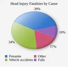Biological, clinical, and demographic factors contribute to the likelihood that an injury will be fatal.[168] In addition, outcome depends heavily on the cause of head injury. In the US, patients with fall-related TBIs have an 89% survival rate, while only 9% of patients with firearm-related TBIs survive.[173] In the US, firearms are the most common cause of fatal TBI, followed by vehicle accidents and then falls.[168] Of deaths from firearms, 75% are considered to be suicides.[168]