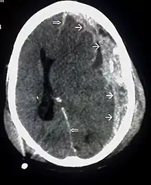 | CT scan showing cerebral contusions, hemorrhage within the hemispheres, and subdural hematoma. There is also displaced skull fracture of left transverse parietal and temporal bones.[2] | |