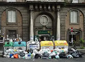 By December 1999, all regional landfills had reached capacity.[12] Reports in 2008 stated that the crisis was caused at least in part by the Camorra, the powerful Campania-based mafia, which created a lucrative business in the municipal waste disposal sector, mostly in the triangle of death. With the complicity of industrial companies, the illegal dumpers frequently mix heavy metals, industrial waste, and chemicals and household waste together, and then dump them near roads and burn them to avoid detection, leading to severe soil and air pollution.[13][14]