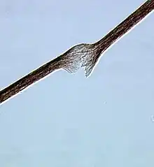 Microscopic analysis of the hair shows twisted hairs of unequal size and different shapes (pili torti, aniso- and poikilotrichosis), longitudinal breaks and breaks located at nodes (trichorrhexis nodosa). Scanning electron microscopy might reveal hair budding (trichorrhexis blastysis). Biochemical analysis may reveal sulfur-deficient, brittle hair (trichothiodystrophy; note that disulfide bonds determine hair waviness).