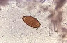 The disease usually spreads when people eat food or drink water containing these worms' eggs.[1] This may occur when contaminated vegetables are not fully cleaned or cooked.[1] Often these eggs are in the soil in areas where people defecate outside and where untreated human feces is used as fertilizer.[2] These eggs originate from the feces of infected people.[1] Young children playing in such soil and putting their hands in their mouths also become infected easily.[1] The worms live in the large bowel and are about four centimetres in length.[2] Whipworm is diagnosed by seeing the eggs when examining the stool with a microscope.[3] Eggs are barrel-shaped.[8] Trichuriasis belongs to the group of soil-transmitted helminthiases.[9]