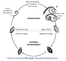 The female T. trichiura produces 2,000–10,000 single-celled eggs per day.[3] Eggs are deposited from human feces to soil where, after two to three weeks, they become embryonated and enter the "infective" stage. These embryonated infective eggs are ingested by hand-mouth or through fomites and hatch in the human small intestine, exploiting the intestinal microflora as a stimulus to hatching.[4] This is the location of growth and molting. The infective larvae penetrate the villi and continue to develop in the small intestine. The young worms move to the caecum and penetrate the mucosa, and there they complete development as adult worms in the large intestine. The life cycle from the time of ingestion of eggs to the development of mature worms takes approximately three months. During this time, there may be limited signs of infection in stool samples, due to a lack of egg production and shedding. The female T. trichiura begin to lay eggs after three months of maturity. Worms commonly live for about one year,[5] during which time females can lay up to 20,000 eggs per day.