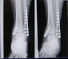A trimalleolar fracture is a fracture of the ankle that involves the lateral malleolus, the medial malleolus, and the distal posterior aspect of the tibia, which can be termed the posterior malleolus. The trauma is sometimes accompanied by ligament damage and dislocation.[1]