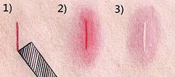 - 1 2 3 Bhute D, Doshi B, Pande S, Mahajan S, Kharkar V (2008). "Dermatographism". Indian J Dermatol Venereol Leprol. 74 (2): 177–9. doi:10.4103/0378-6323.39724. PMID 18388395.