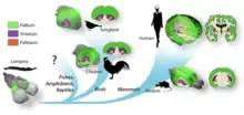 Finally, recent studies based on paleontological data or comparative anatomical evidence strongly suggest that the neocortex was already present in the earliest emerging mammals.[13] In addition, although non-mammals do not have a neocortex in the true sense (that is, a structure comprising part of the forebrain roof, or pallium, consisting of six characteristic layers of neurons), they possess pallial regions, and some parts of the pallium are considered homologous to the mammalian neocortex. While these areas lack the characteristic six neocortical layers, birds and reptiles generally possess three layers in the dorsal pallium (the homolog of the mammalian neocortex).[13][16] The telencephalon of birds and mammals makes neuroanatomical connections with other telecencephalic structures[13] like those made by neocortex. It mediates similar functions such as perception, learning and memory, decision making, motor control, conceptual thinking.