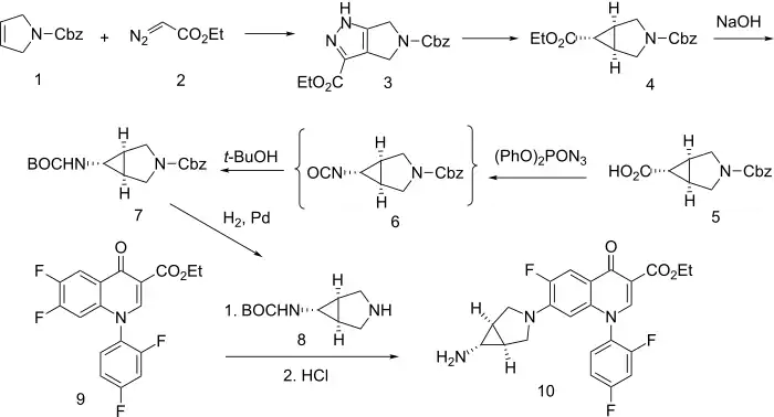 The key reaction in building the ring consists of 1,3-Dipolar cycloaddition of ethyl diazoacetate to N-Cbz-3-pyrroline to afford the pyrrazolidine (3). Pyrolysis results in loss of nitrogen and formation of the cyclopropylpyrrolidine ring. The stereochemistry of the ring simply reflects the thermodynamics, since cis ring fusion is by far the most stable arrangement, as is the cis configuration of the ester group. The ester is then saponified to the corresponding carboxylic acid (5). The acid undergoes a version of the Curtius rearrangement when treated with diphenylphosphoryl azide (DPPA) to afford the transient isocyanate (6). The reactive function adds t-BuOH from the reaction medium to afford the product as its tert-Butyloxycarbonyl protecting group derivative (7). Catalytic hydrogenation then removes the carbobenzyloxy protecting group to afford the secondary amine (8). In a standard quinoline reaction, this amine is then used to displace the more reactive fluorine at the 7-position in Ethyl 1-(2,4-difluorophenyl)-6,7-difluoro-4-oxo-1,4-dihydro-1,8-naphthyridine-3-carboxylate (9).[3]