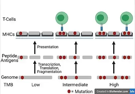 One survival mechanism in tumors is to increase the expression of immune checkpoint molecules that can bind to tumor-specific T-cells and inactivate them, so that the tumor cells cannot be detected and killed.[11] ICIs have been shown to improve patients' response and the survival rates as they help the immune system to target tumor cells.[1][10] However, there is a variation in response to ICIs among patients and it is crucial to know which patients can benefit from ICI therapy.[1] The expression of PD-L1 (programmed death-ligand 1; one of the immune checkpoints) has been demonstrated to be a good biomarker of PD-L1 blockade therapy in some cancers.[10] However, there is a need for better biomarkers as there are some predictive errors with PD-L1 expression.[10] Studies on TMB have illustrated that there is an association between patients' outcome (of ICI therapy) and the TMB value.[1] It has been proposed that TMB can be used as a predictive marker of response in ICI therapy across many cancer types.[10] Also, TMB can be helpful to identify individuals that can benefit from ICI therapy with cancers that generally have low TMB values.[10] Furthermore, it has been shown that tumors with higher TMB values usually result in a higher number of neoantigens, the antigens that are presented on the tumor cells surface that are usually a result of missense mutations.[10] So, TMB can be a good estimator of neoantigen load and can help find the patients who can benefit from ICI therapy by increasing the chance of detecting the neoantigens.[10] However, it is important to note that different sequencing platforms and bioinformatics pipelines have been used to estimate TMB and it is important to harmonize TMB quantification protocols and procedures before it can be used as a reliable biomarker.[1][12] There have been some efforts to standardize these methods.[1]