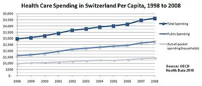 This graph contrasts total health care spending with public spending, in US dollars adjusted for purchasing power parity in Switzerland.