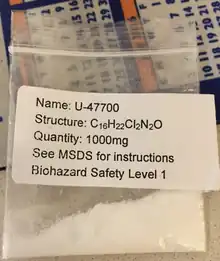 - ↑ Coopman V, Blanckaert P, Van Parys G, Van Calenbergh S, Cordonnier J (September 2016). "A case of acute intoxication due to combined use of fentanyl and 3,4-dichloro-N-[2-(dimethylamino)cyclohexyl]-N-methylbenzamide (U-47700)". Forensic Science International. 266: 68–72. doi:10.1016/j.forsciint.2016.05.001. hdl:1854/LU-8509152. PMID 27235591.