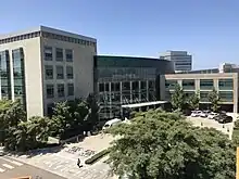 Jacobs Medical Center opened on November 20, 2016.[4] It is the second component of UC San Diego Health's two-campus strategy and provides specialized quaternary care not available elsewhere in San Diego County. The 364-bed advanced medical center is divided into four separate pavilions: Thornton Pavilion, Vassiliadis Pavilion (floors 2–3), Foster Pavilion (floors 4–6), and Rady Pavilion (floors 8–10). The A. Vassiliadis Family Pavilion for Advanced Surgery includes intraoperative MRI machines and the only Restrictive Spectrum Imaging facility in the United States. The Pauline and Stanley Foster Pavilion for Cancer Care houses a blood and marrow transplant program jointly operated by UC San Diego Health and Sharp Healthcare, the floor for which is completely pressurized and filtered allowing patients to roam freely. The Rady Pavilion for Women and Infants includes a Level III Neonatal Intensive Care Unit, eight labor rooms, 32 private postpartum rooms, and a three-room midwifery birth center.[5] Each of the hospital's private rooms is equipped with an Apple iPad for controlling lighting, checking medical records, and contacting care providers.[4] The facility is named for Joan and Irwin Jacobs in recognition of a $75 million gift they made to support its construction.