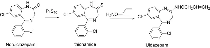 Reaction of thionamide (2) with O-allyl-hydroxylamine gave the oximino (3) uldazepam.