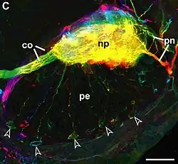 ![]() Example of several unipolar neurons from a nerve ganglion of a velvet worm (a primitive arthropod). The neurons were stained for serotonin immunoreactivity, and photographed using a confocal microscope, with multiple images overlaid and color-coded according to depth. Arrows mark the peripherally located cell bodies of several neurons, whose neurites extend into the central neuropil (np), where their complex ramifications are indiscernible. Scale bar: 50 micrometres.[1] | |